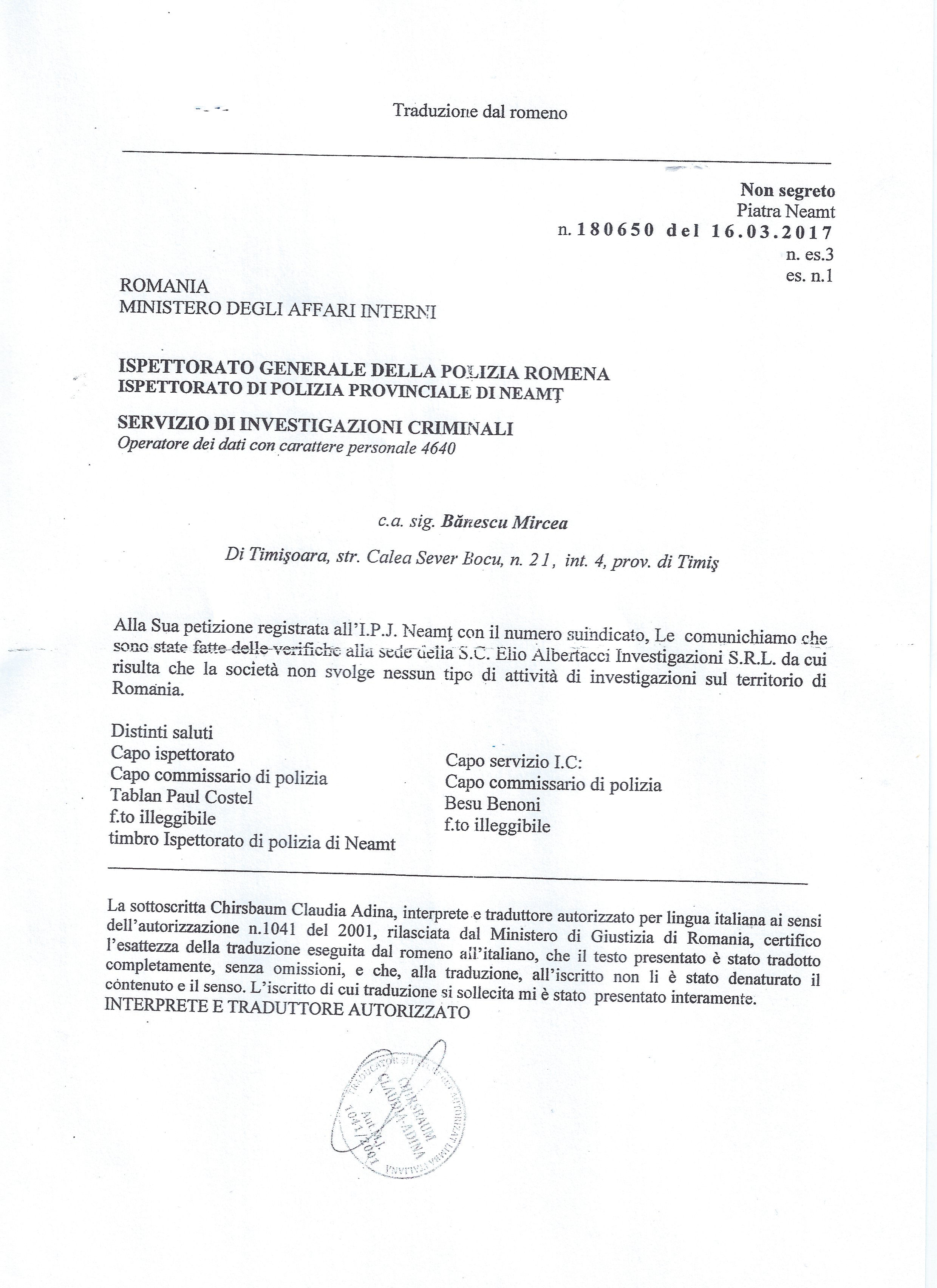 • Richiedete sempre che la persona con la quale viene concluso il contratto, presenti la propria tessera di investigatore privato oppure, secondo il caso, che vi dica in quale qualitĂ  firma il contratto di investigazione , (obbligatoriamente – il direttore esecutivo). Richiedete che vi sia illustrato il permesso di funzionamento della societĂ  (se non lo vedete sul sito)e, se avete il minimo dubbio su qualsiasi aspetto di irregolaritĂ , non esitate a chiedere informazioni sull’azienda presso l’Ispettorato di Polizia del distretto Timis – Ufficio Investigazioni Criminali –Inspectoratul de Politie Judetean Timis